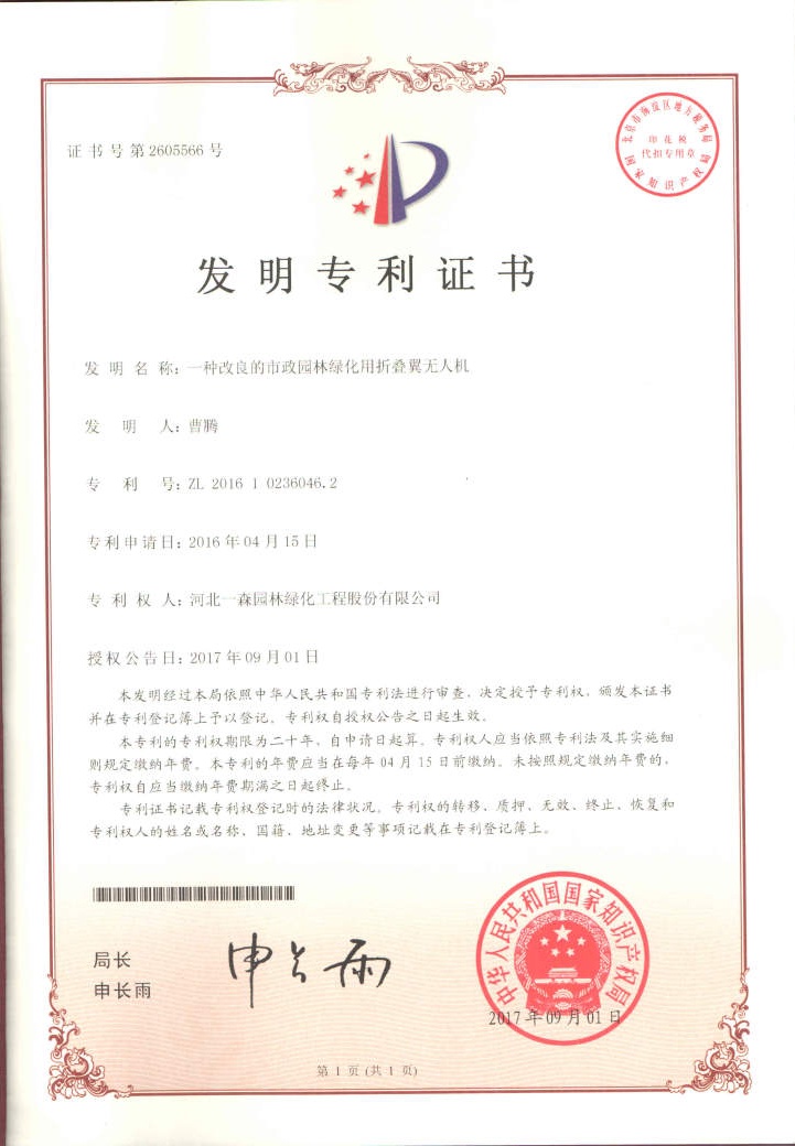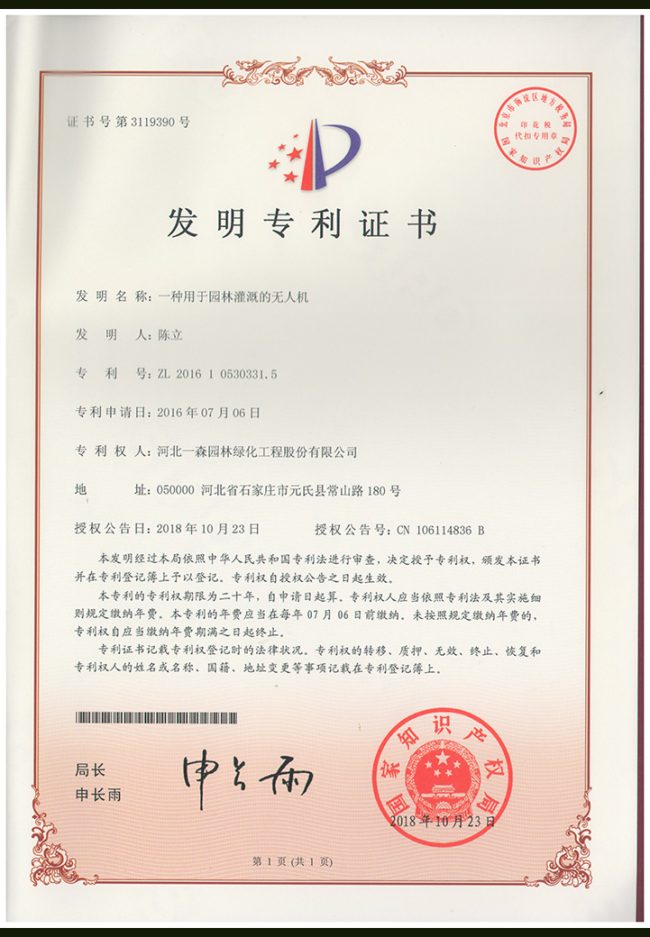 “一種用于園林灌溉的無人機(jī)”發(fā)明專利證書